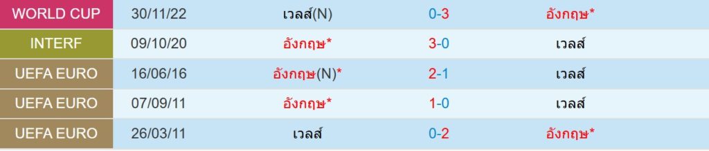 สถิติพบกัน 5 นัดหลังสุดของ : อังกฤษ -vs- เวลส์