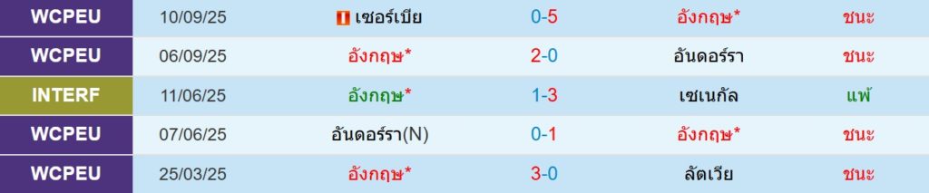 สถิติ 5 นัดหลังสุดของ : อังกฤษ